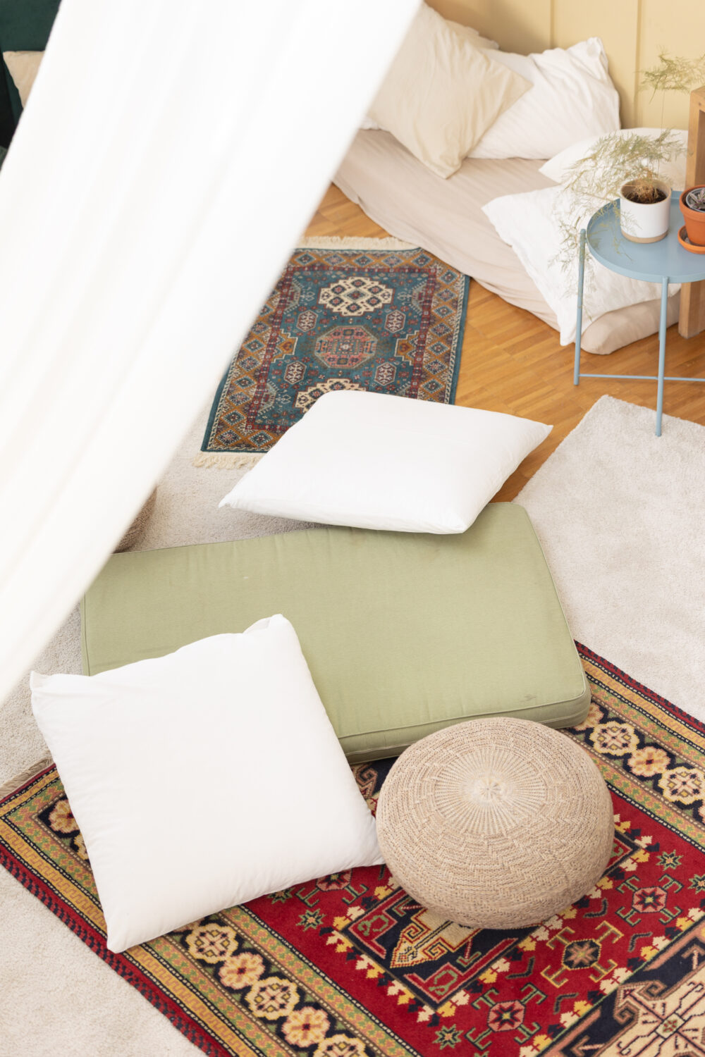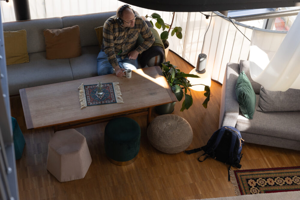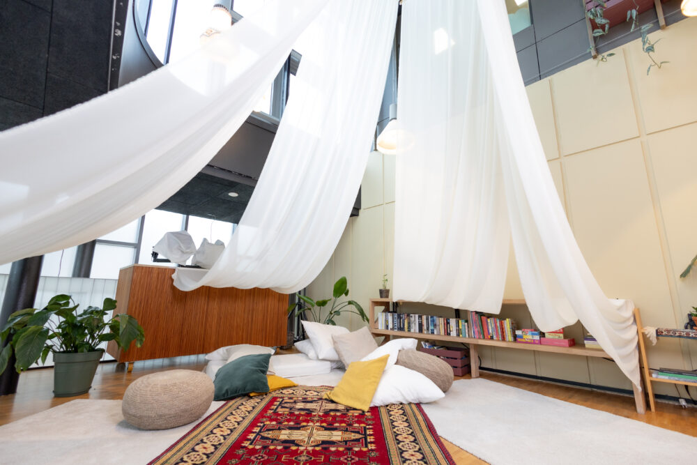 Teateret har et permanent avslapningssted i andre etasje av nybygget. Dette er et sted hvor du forhåpentligvis kan finne ro og ha mindre sansestimulering. Vi har tilgjengelige hørselsvern for å blokkere ut lyd, området er alkoholfritt, og du kan slappe av på våre madrasser og puter under våre myke tekstiler som henger fra taket.
